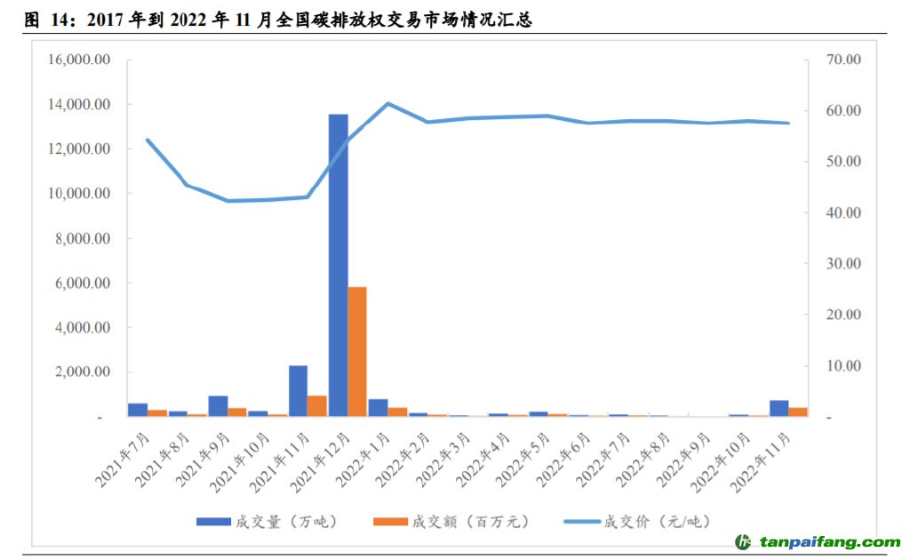 履約周期的履約完成率為 99.5%,也表示著我國全國碳排放權交易 市場運作的良好開端。2022 年 1 月至 2022 年 11 月,推測受疫情影響,企業(yè)對于碳 排放量的需求較少,因此成交量和成交額一直處在比較低迷的狀態(tài),預測 12 月的碳 成交量和成交額會有一定程度的回升。