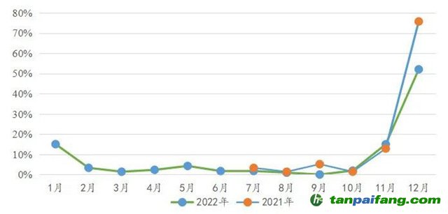 圖4 全國(guó)碳市場(chǎng)各月成交量占總成交量的比例 內(nèi)/容/來(lái)/自:中-國(guó)/碳-排*放^交%易#網(wǎng)-tan p a i fang . com