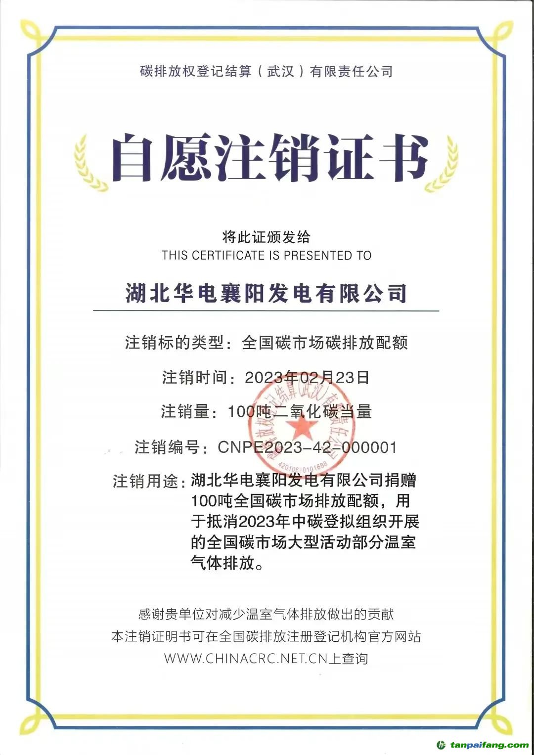 碳中和,中國華電積極向中碳登捐贈(zèng)碳配額,用于抵銷2023年中碳登組織開展的全國碳市場(chǎng)大型活動(dòng)溫室氣體排放。湖北華電襄陽發(fā)電有限公司自愿注銷100噸全國碳排放配額,中國華電集團(tuán)碳資產(chǎn)運(yùn)營(yíng)有限公司現(xiàn)場(chǎng)提交自愿注銷申請(qǐng),完成自愿注銷在線操作,并通過中碳登審核,收到中碳登頒發(fā)的“全國碳市場(chǎng)碳排放配額自愿注銷證書”,為全國大型活動(dòng)實(shí)現(xiàn)“