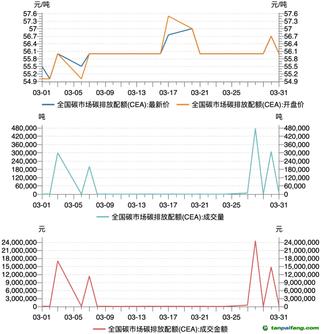3月全國(guó)碳市場(chǎng)碳排放配額(CEA)總成交量130.76萬噸,總成交額6895.49萬元。掛牌協(xié)議交易月成交量3.16萬噸,月成交額177.46萬元,最高成交價(jià)57.50元/噸,最低成交價(jià)55.00元/噸。3月最后一個(gè)交易日收盤價(jià)為56.00元/噸,較2月最后一個(gè)交易日上漲1.82%。大宗協(xié)議交易月成交量127.60萬噸,月成交額6718.02萬元。截至3月31日,CEA累計(jì)成交量2.33億噸,累計(jì)成交額106.62億元。 本文+內(nèi)-容-來-自;中^國(guó)_碳+排.放_(tái)交^易=網(wǎng) t a n pa ifa ng .c om
