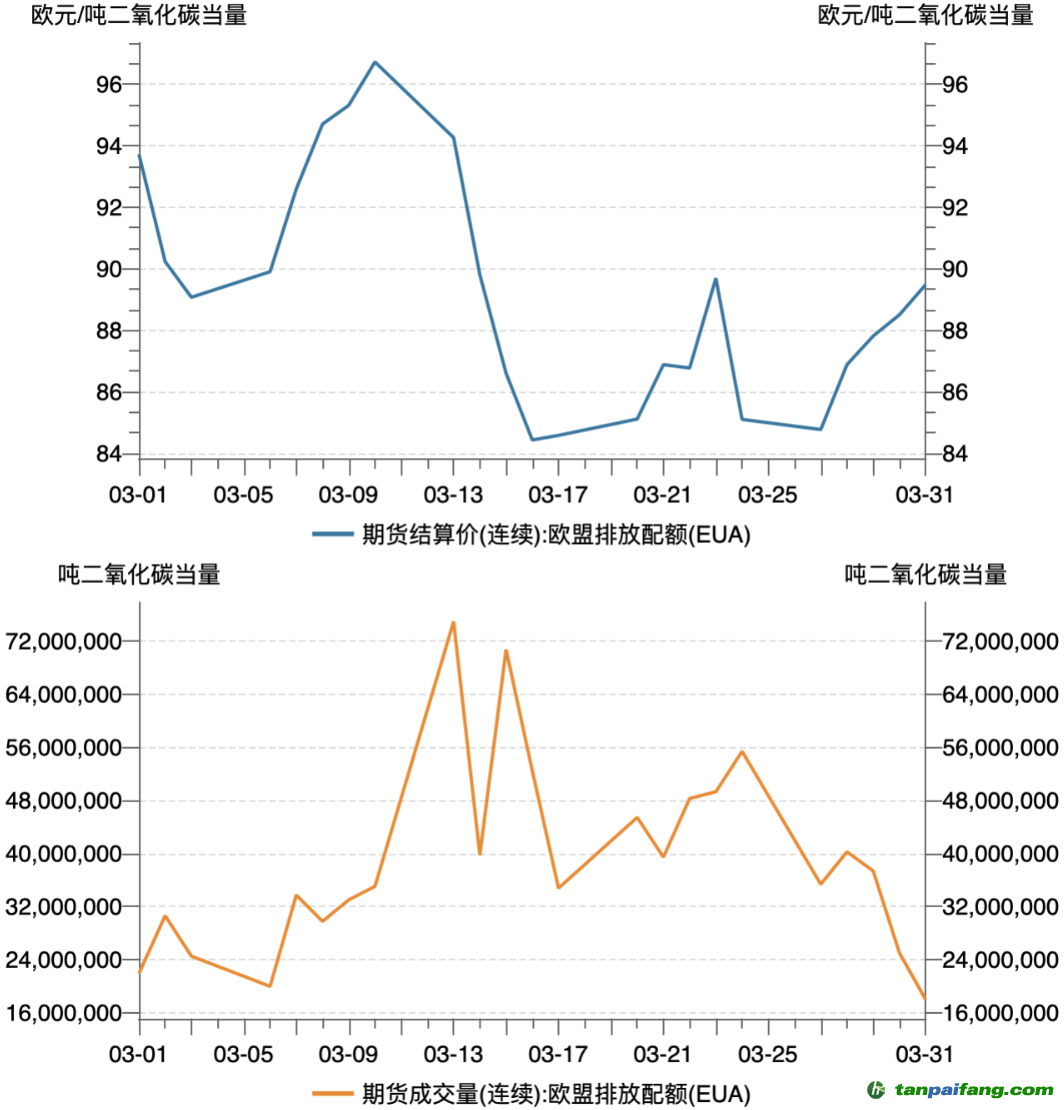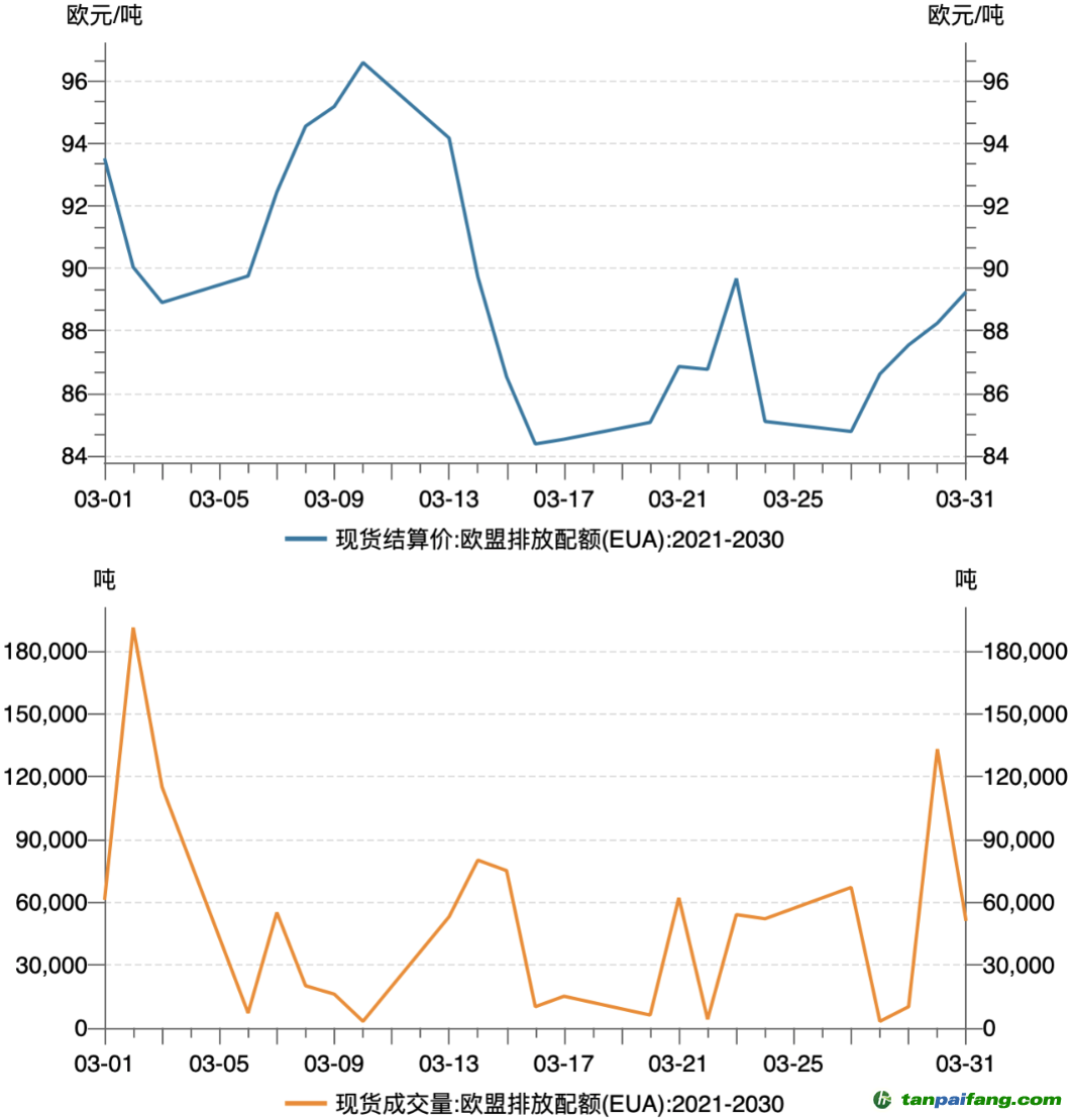 3月歐盟碳排放配額(EUA)現(xiàn)貨總成交量114.30萬噸,總成交金額1.02億歐元,現(xiàn)貨成交均價(jià)89.17歐元/噸;期貨總成交量8.95億噸,總成交金額795.73億歐元,期貨成交均價(jià)88.95歐元/噸。3月EUA現(xiàn)貨結(jié)算價(jià)最低84.37歐元/噸,最高96.59歐元/噸;期貨結(jié)算價(jià)最低84.43歐元/噸,最高96.72歐元/噸。 夲呅內(nèi)傛萊源亍:ф啯碳*排*放^鮫*易-網(wǎng) τā ńpāīfāńɡ.cōm