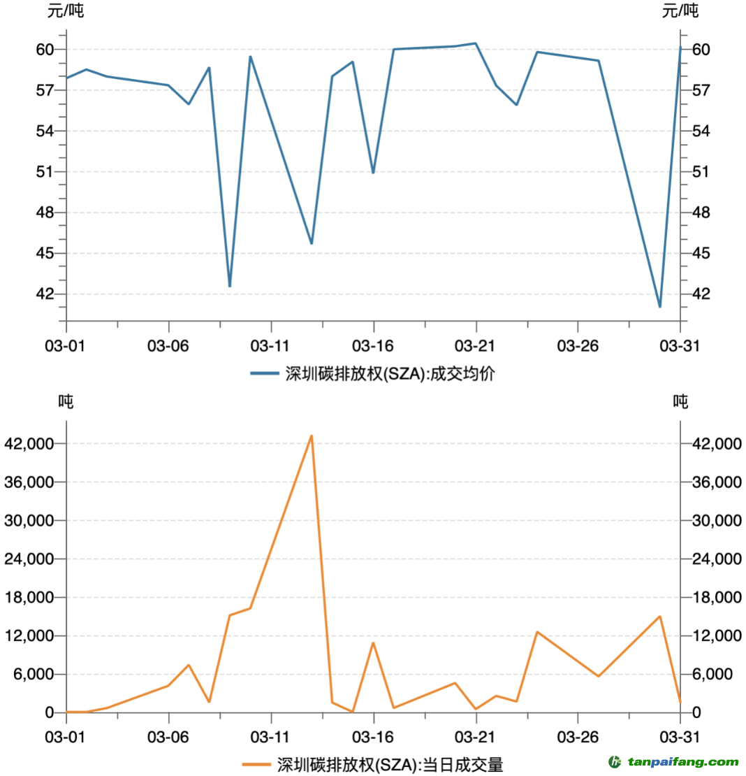 3月深圳碳市場(chǎng)碳排放配額(SZEA)總成交量14.48萬噸,總成交額734.22萬元。期間,最高成交價(jià)61.00元/噸,最低成交價(jià)52.90元/噸,成交均價(jià)50.69元/噸。3月最后一個(gè)交易日收盤價(jià)60.23元/噸,較2月最后一個(gè)交易日收盤價(jià)58.00元/噸上漲3.84%。截至3月31日,SZEA累計(jì)成交量5590.18萬噸,累計(jì)成交額14.46億元。 本+文`內(nèi).容.來.自:中`國(guó)`碳`排*放*交*易^網(wǎng) t a np ai fan g.com