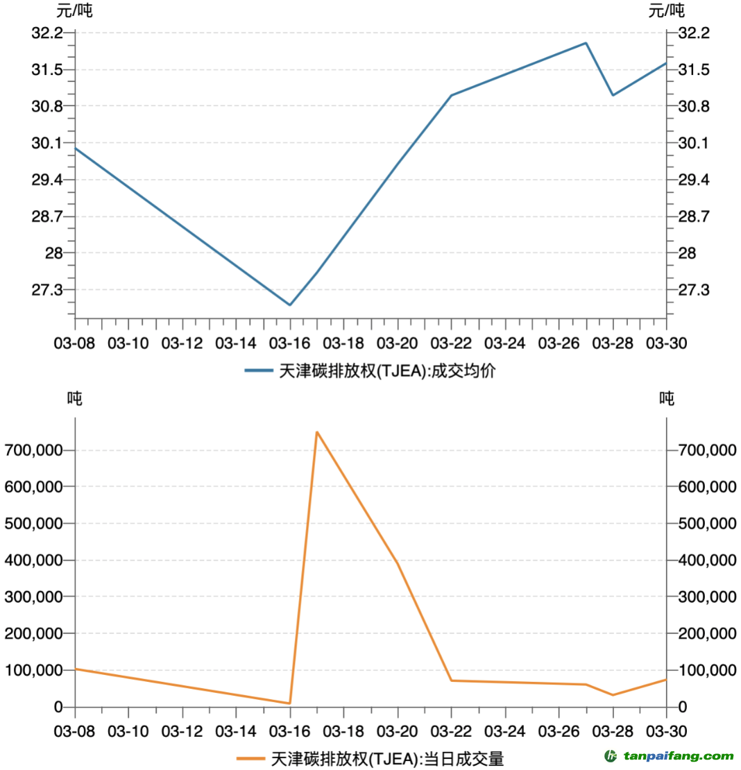 3月天津碳市場(chǎng)碳排放配額(TJEA)總成交量148.43萬噸,總成交額4293.69萬元,月成交均價(jià)28.93元/噸。3月最后一個(gè)交易日成交均價(jià)31.62元/噸,較2月最后一個(gè)交易日成交均價(jià)30.01元/噸上漲5.36%。截至3月31日,TJEA累計(jì)成交量2666.48萬噸,累計(jì)成交額6.73億元。 本`文@內(nèi)/容/來/自:中-國(guó)^碳-排-放^*交*易^網(wǎng)-tan pai fang. com