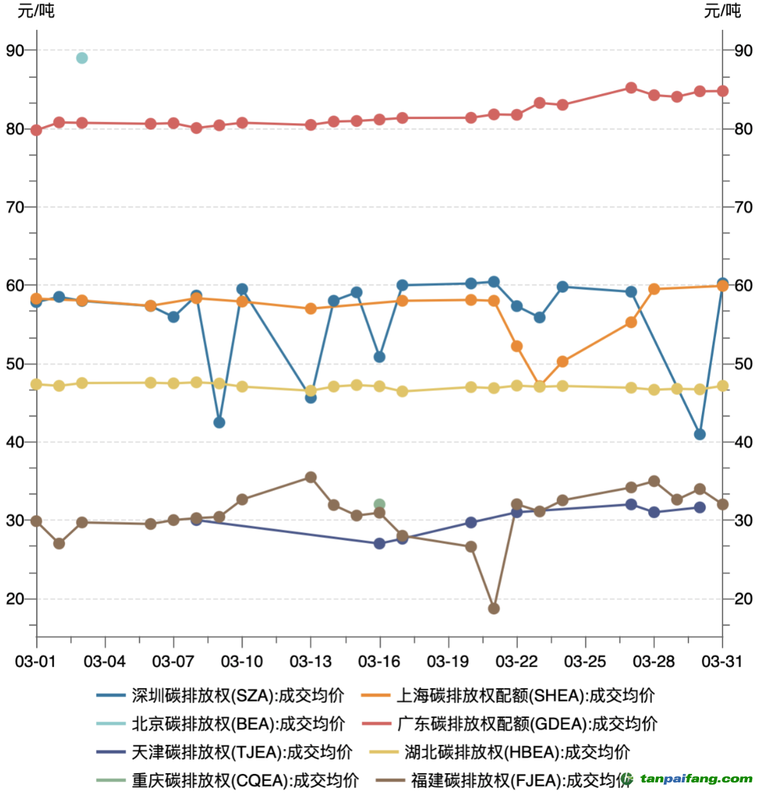 圖1:國(guó)內(nèi)區(qū)域碳市場(chǎng)3月成交均價(jià) 本+文`內(nèi)/容/來/自:中-國(guó)-碳-排-放-網(wǎng)-tan pai fang . com