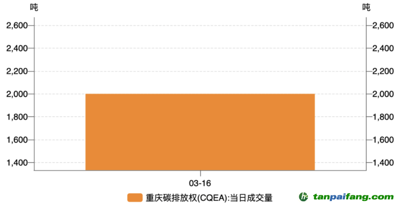 3月重慶碳市場(chǎng)碳排放配額(CQEA)總成交量2000噸,總成交額6.4萬元,月成交均價(jià)32.00元/噸。月內(nèi)僅3月16日發(fā)生交易。截至3月31日,CQEA累計(jì)成交量1056.92萬噸,累計(jì)成交額9913.10萬元。