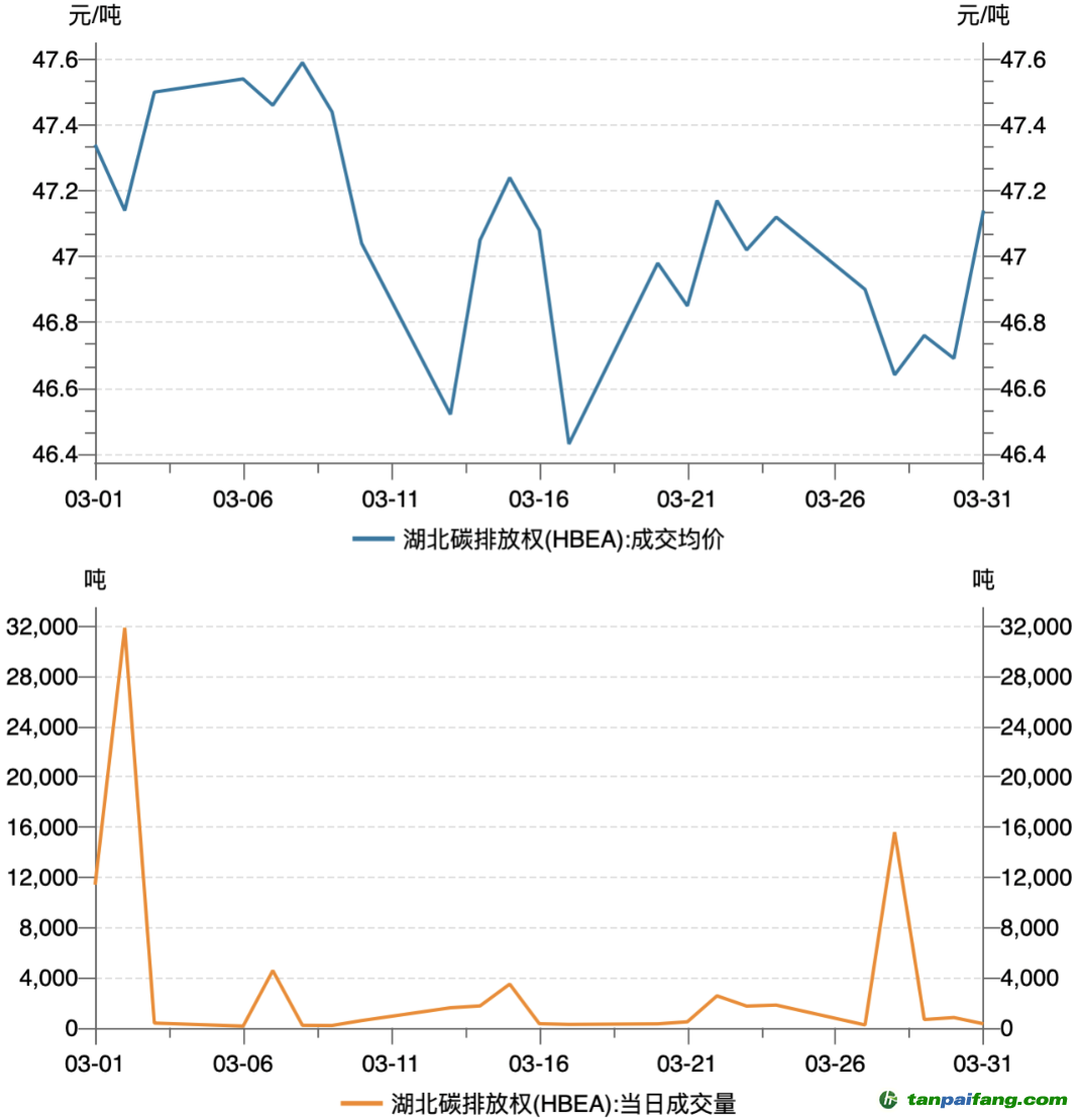 3月湖北碳市場(chǎng)碳排放配額(HBEA)總成交量8.09萬噸,總成交額380.97萬元。期間,最高成交價(jià)51.90元/噸,最低成交價(jià)46.01元/噸,成交均價(jià)47.07元/噸。3月最后一個(gè)交易日收盤價(jià)47.82元/噸,較2月最后一個(gè)交易日收盤價(jià)51.33元/噸下跌6.84%。截至3月31日,HBEA累計(jì)成交量8591.79萬噸,累計(jì)成交額21.58億元。 禸嫆@唻洎:狆國(guó)湠棑倣茭昜蛧 τāńpāīfāńɡ.cōm