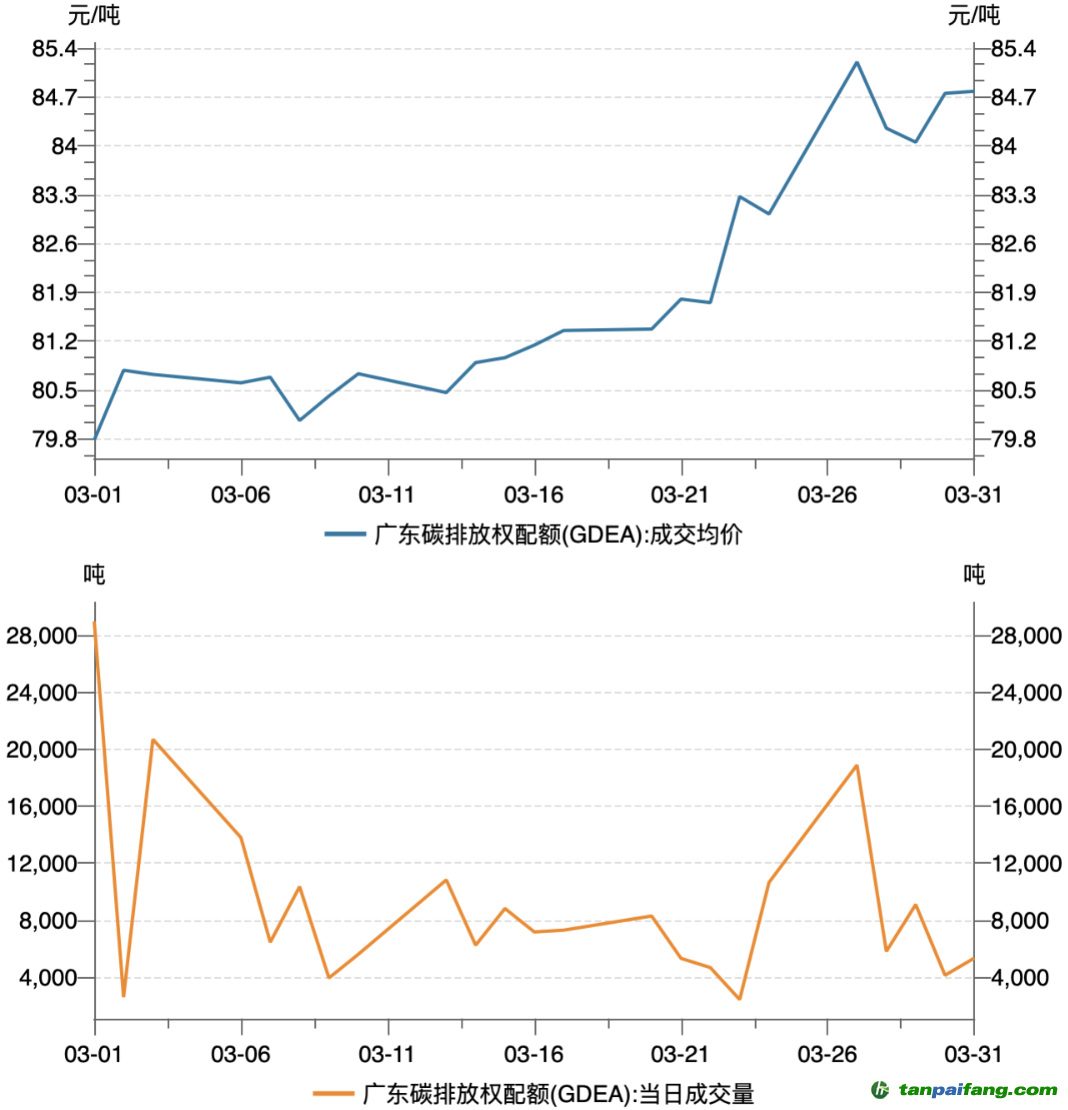 3月廣東碳市場(chǎng)碳排放配額(GDEA)總成交量20。74萬噸,總成交額1693.49萬元。期間,最高成交價(jià)91.00元/噸,最低成交價(jià)77.00元/噸,成交均價(jià)81.64元/噸。3月最后一個(gè)交易日收盤價(jià)84.77元/噸,較2月最后一個(gè)交易日收盤價(jià)80.12元/噸上漲5.80%。截至3月31日,GDEA累計(jì)成交量1.93億噸,累計(jì)成交額48.05億元。