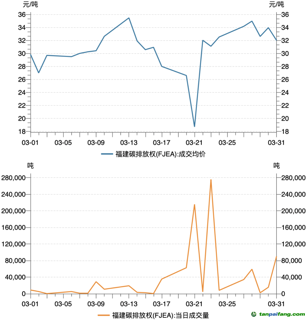 3月福建碳市場(chǎng)碳排放配額(FJEA)總成交量88.59萬噸,總成交額2500.34萬元。期間,成交均價(jià)28.22元/噸。3月最后一個(gè)交易日收盤價(jià)32.00元/噸,較2月最后一個(gè)交易日收盤價(jià)30.70元/噸上漲4.23%。