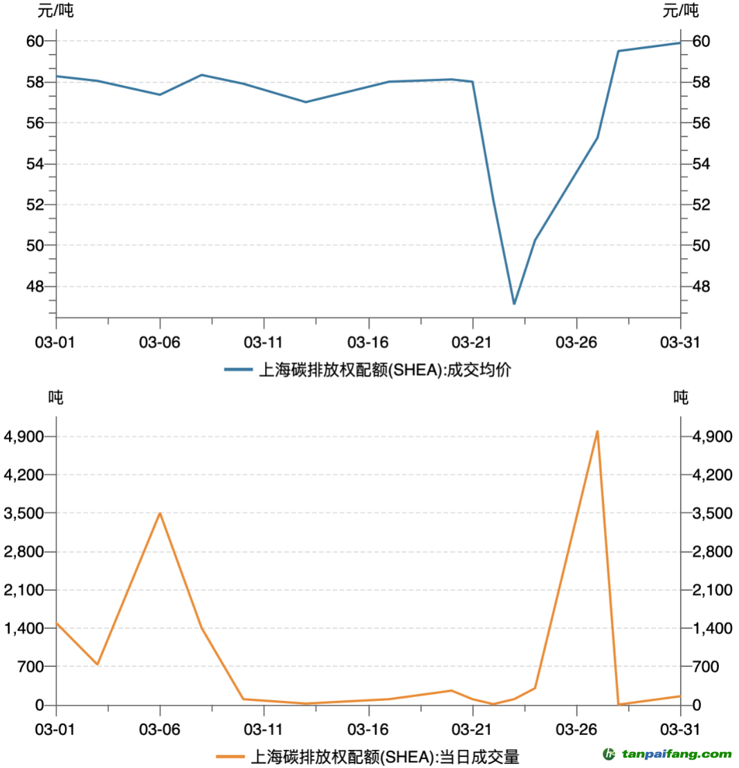 3月上海碳市場(chǎng)碳排放配額(SHEA)總成交量1.43萬噸,總成交額80.92萬元,成交均價(jià)56.77元/噸。3月最后一個(gè)交易日收盤價(jià)59.90元/噸,較2月最后一個(gè)交易日收盤價(jià)58.76元/噸上漲1.94%。截至3月31日,SHEA累計(jì)成交量4802.00萬噸,累計(jì)成交額12.08億元。