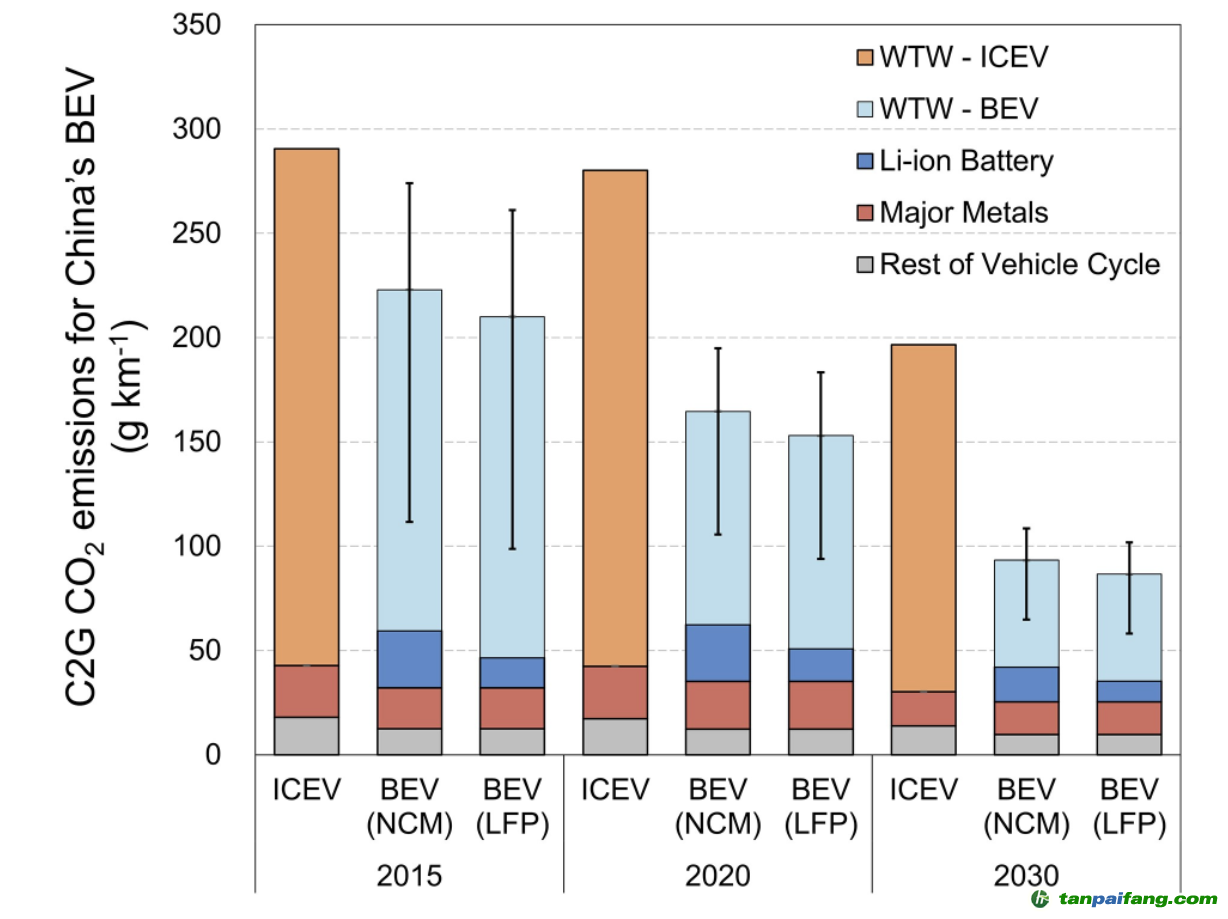 圖2.2015、2020及2030年中國純電動汽車的全生命周期CO2排放強度