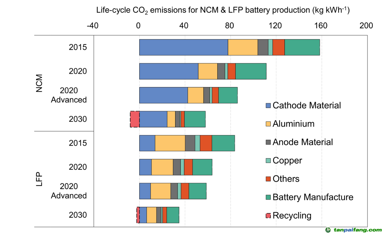 圖1.中國三元鋰電池(NCM)及磷酸鐵鋰電池(LFP)的生命周期CO2排放強度(kg?kWh-1)