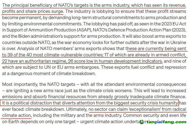 報(bào)告警告,北約的所作所為在助長(zhǎng)沖突的同時(shí)加速了氣候惡化,并引發(fā)新的軍備競(jìng)賽,從而又將進(jìn)一步增加碳排放,導(dǎo)致更多氣候行動(dòng)資金被挪用,并轉(zhuǎn)移世界對(duì)“氣候崩潰”這一人類(lèi)有史以來(lái)最大安全危機(jī)的注意力。 本%文$內(nèi)-容-來(lái)-自;中_國(guó)_碳|排 放_(tái)交-易^網(wǎng)^t an pa i fang . c om