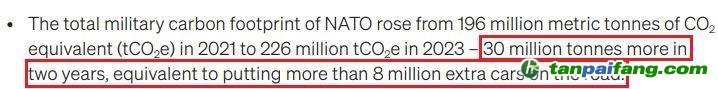 從2021年到2023年,北約的軍事行動(dòng)碳排放從1.96億噸二氧化碳當(dāng)量增加到2.26億噸二氧化碳當(dāng)量,兩年內(nèi)增加3000萬(wàn)噸,相當(dāng)于在道路上增加800多萬(wàn)輛汽車(chē)。 夲呅內(nèi)傛萊源亍:ф啯碳*排*放^鮫*易-網(wǎng) τā ńpāīfāńɡ.cōm