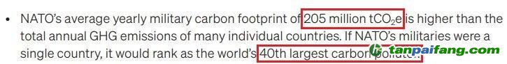 北約平均每年的軍事行動(dòng)碳排放為2.05億噸二氧化碳當(dāng)量,高于許多國(guó)家每年的碳排放總量。如果將北約視為一個(gè)國(guó)家,它將成為世界上第40大碳污染國(guó)。