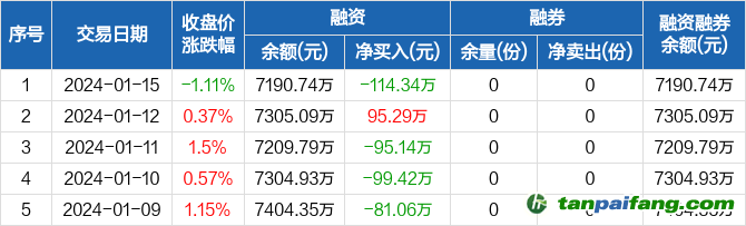 碳中和ETF融資融券信息顯示,2024年1月15日融資凈償還114.34萬元;融資余額7190.74萬元,較前一日下降1.57%。 本文`內-容-來-自;中_國_碳_交^易=網 tan pa i fa ng . c om