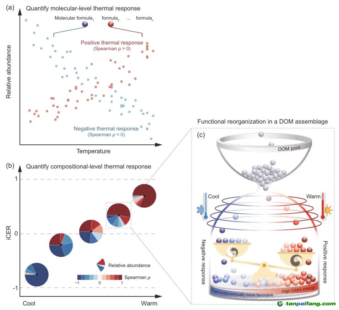 研究表明,溶解有機碳分子對溫度的響應(yīng)力與其分子特征相關(guān)聯(lián),表現(xiàn)為:降解程度越高的有機碳對溫度具有越高的正響應(yīng),而難降解有機碳對溫度具有負響應(yīng);每個有機碳分子對溫度的響應(yīng)力在不同氣候區(qū)表現(xiàn)出類似的響應(yīng)特征。這一結(jié)果首次從微觀層面揭示了即使在不同氣候區(qū),有機碳分子對溫度的響應(yīng)具有普適性規(guī)律。