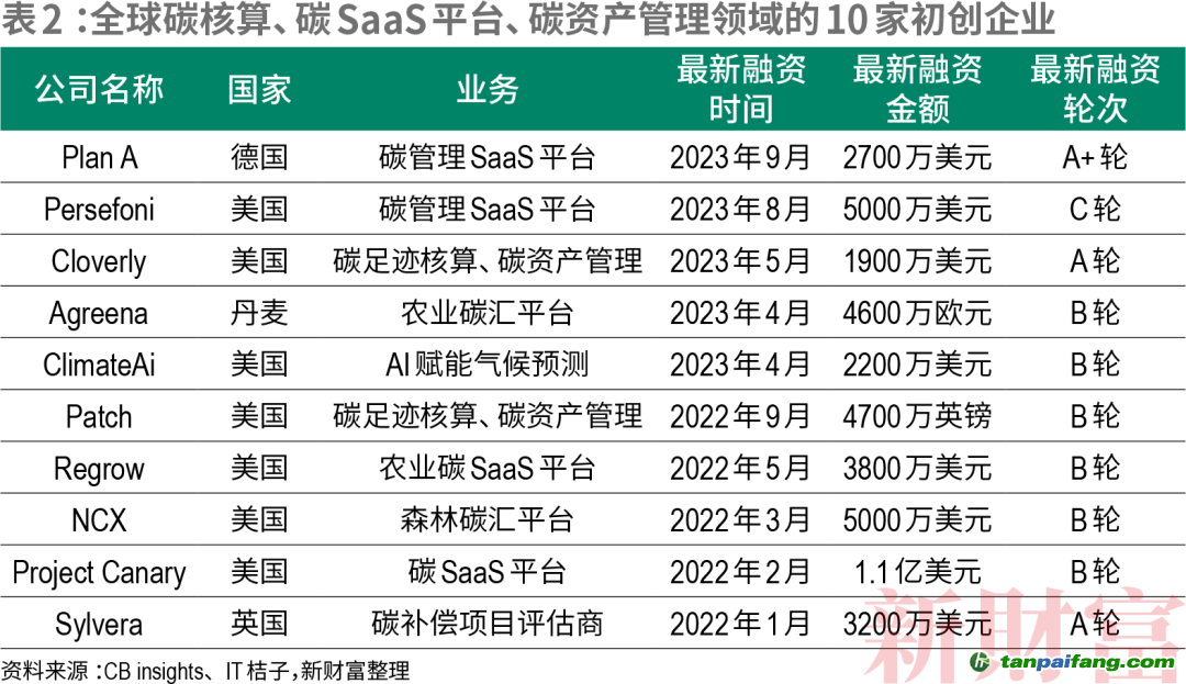 中國(guó)脫碳科技初創(chuàng)公司的崛起背后,是全球這一賽道融資加速,碳核算、碳SaaS平臺(tái)、碳資產(chǎn)管理領(lǐng)域的10家全球領(lǐng)先企業(yè),融資額幾乎全部過(guò)億(表2)。 內(nèi)-容-來(lái)-自;中_國(guó)_碳_0排放¥交-易=網(wǎng) t an pa i fa ng . c om