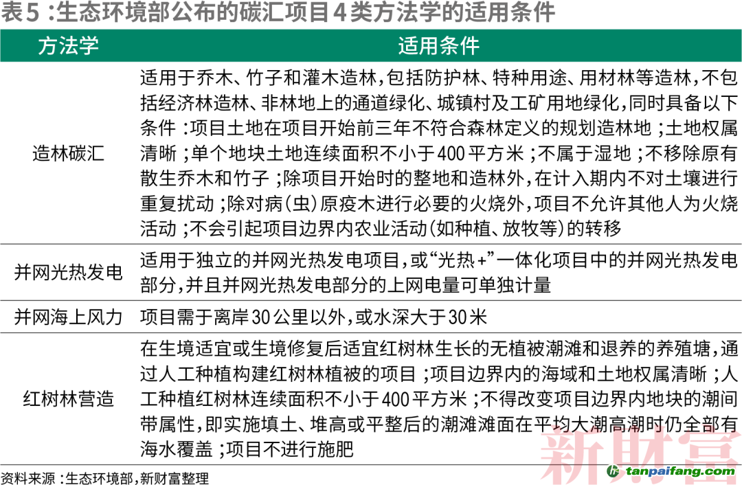 那么,是否隨便一片紅樹(shù)林或森林都可以開(kāi)發(fā)成CCER項(xiàng)目用以出售?從生態(tài)環(huán)境部公布的4類(lèi)方法學(xué)來(lái)看,碳匯項(xiàng)目對(duì)原本土地條件有嚴(yán)格的要求(表5)。