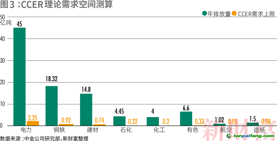 供需缺口擴(kuò)大,是這一市場(chǎng)重啟的主要原因。據(jù)統(tǒng)計(jì),全國(guó)碳市場(chǎng)第一個(gè)履約期結(jié)束時(shí),約6000萬(wàn)噸的CCER已被抵消,占已簽發(fā)減排量的75%左右,剩余簽發(fā)減排量已不足2000萬(wàn)噸。同時(shí),若以5%為CCER抵消比例上限,且電力、鋼鐵、建材、石化、化工、有色、造紙、航空八大重點(diǎn)排放行業(yè)全部納入碳市場(chǎng),則CCER年需求量將達(dá)到4.78億噸(圖3)。
