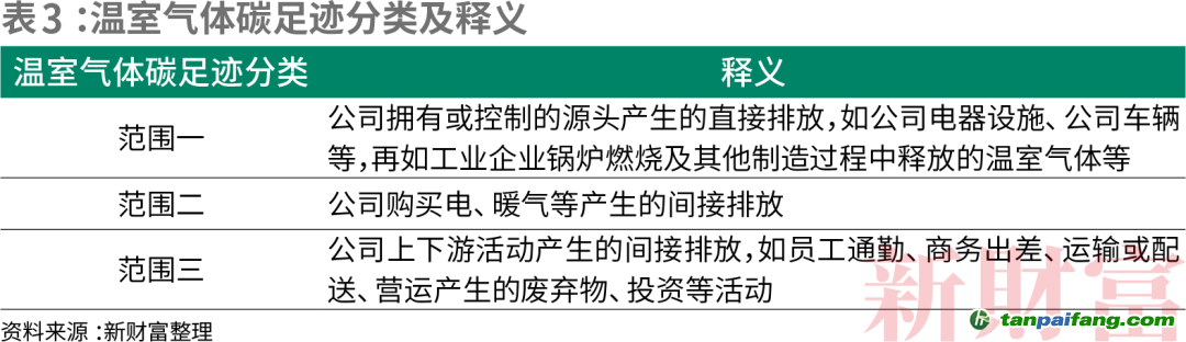 對(duì)于一家企業(yè)而言,其溫室氣體足跡來(lái)源于三大范圍:范圍一為公司擁有或控制的源頭產(chǎn)生的直接排放;范圍二為公司購(gòu)買(mǎi)電、暖氣等產(chǎn)生的間接排放,于普通公司而言,外購(gòu)電力是這一范圍的最大排放源;范圍三包含了公司上下游活動(dòng)產(chǎn)生的間接排放,是企業(yè)碳排放總量中占比最高,也最難識(shí)別與篩查的一部分(表3)。