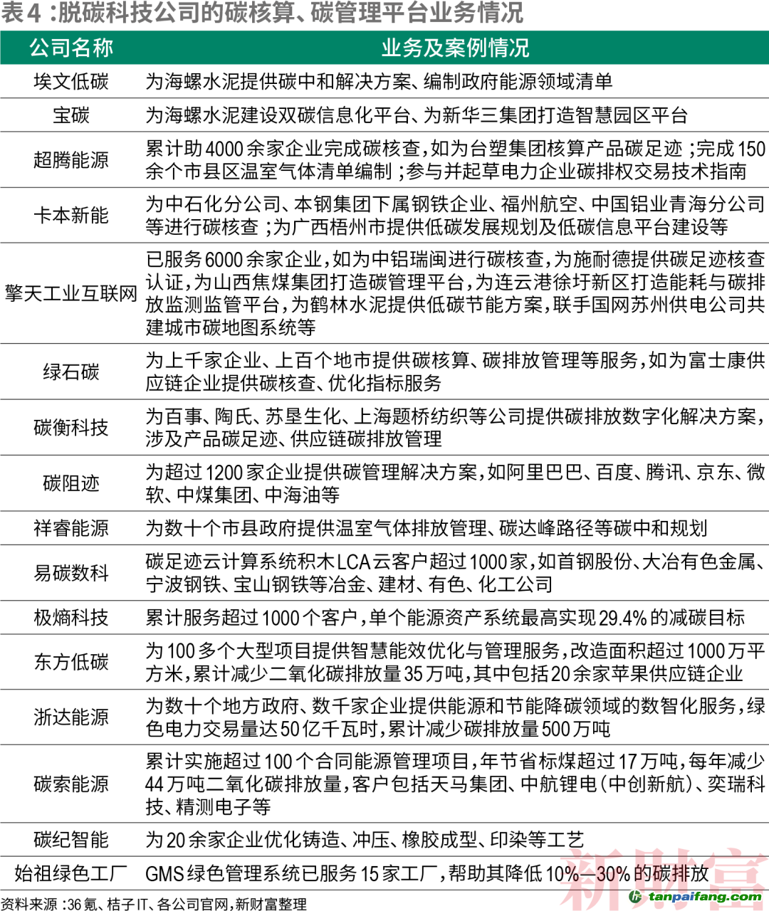 在這一領(lǐng)域,頭部企業(yè)的客戶量已以千為單位。公開(kāi)資料顯示,擎天工業(yè)互聯(lián)網(wǎng)的SaaS解決方案已服務(wù)6000余家企業(yè);超騰能源助4000余家企業(yè)完成碳核查;碳阻跡為超過(guò)1200家企業(yè)提供碳管理解決方案;綠石碳為上千家企業(yè)、上百個(gè)地市提供碳核算、碳排放管理等服務(wù);易碳數(shù)科的積木LCA云客戶超過(guò)1000家(表4)。 本`文-內(nèi).容.來(lái).自:中`國(guó)^碳`排*放*交^易^網(wǎng) ta np ai fan g.com