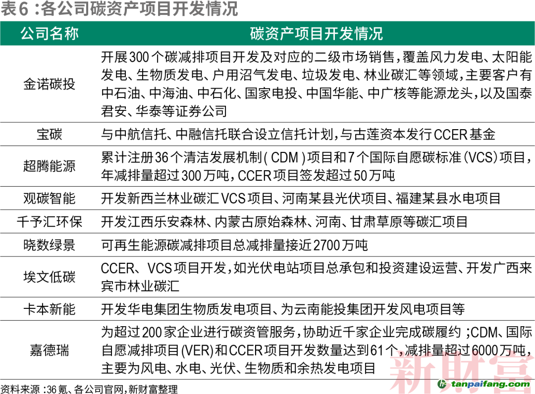 以金諾碳投為例,其主要接受排控企業(yè)的委托,代其進(jìn)行資產(chǎn)申報(bào)和簽發(fā),同時(shí)與擁有風(fēng)電、光伏、林業(yè)、濕地等資源方合作開(kāi)發(fā)CCER及國(guó)際自愿減排項(xiàng)目,并負(fù)責(zé)二級(jí)市場(chǎng)的包銷(xiāo)(表6)。目前,其已累計(jì)完成6000萬(wàn)噸CCER和CEA交易,交易金額超過(guò)30億元。 禸嫆@唻洎:狆國(guó)湠棑倣茭昜蛧 τāńpāīfāńɡ.cōm