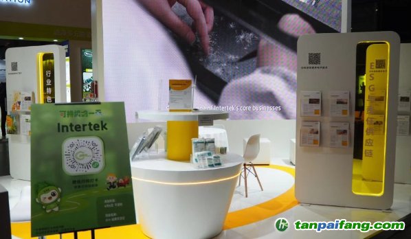 Intertek 的展臺(tái)設(shè)計(jì)簡(jiǎn)潔大氣,以明亮閃耀的黃色和生機(jī)盎然的綠色為主色調(diào),展臺(tái)劃分為多個(gè)區(qū)域,低碳服務(wù)、ESG與責(zé)任供應(yīng)鏈、新材料,及覆蓋紡織、能源及