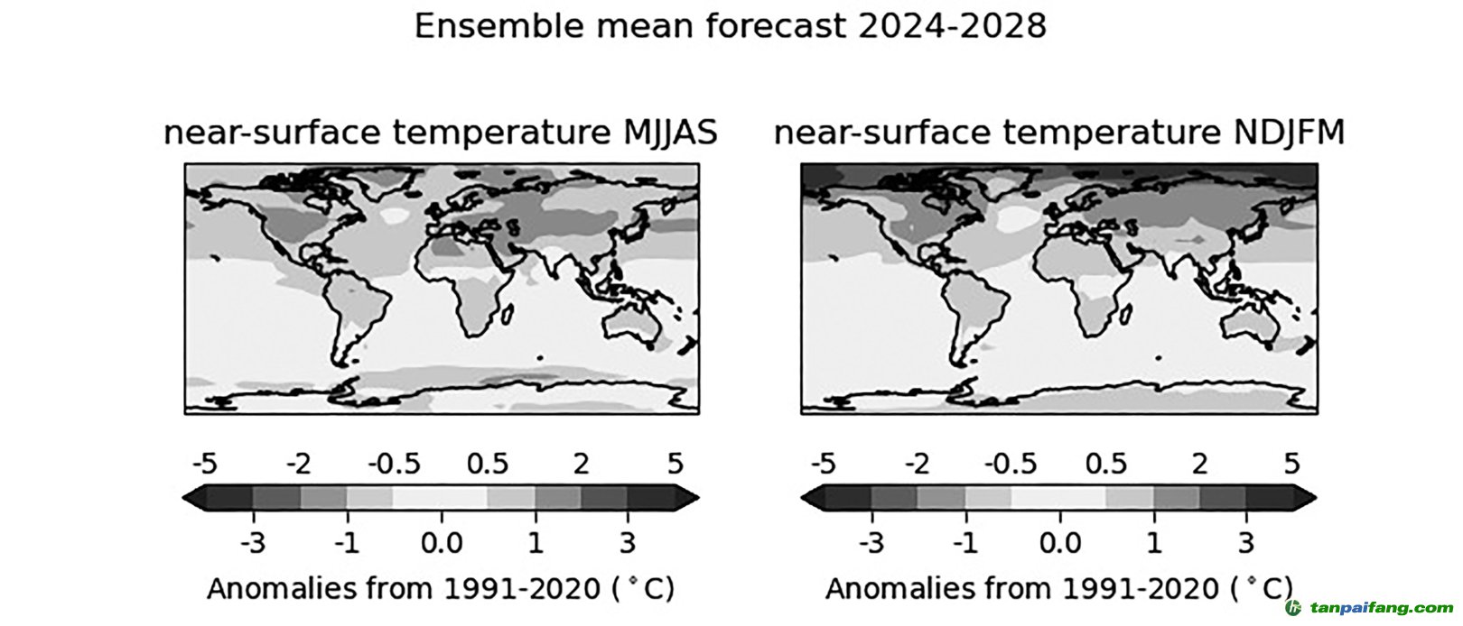 報(bào)告預(yù)測2024年至2028年全球平均溫度距平(℃)(相對于1991年至2020年平均值),上圖為5月至9月,下圖為11月至3月。圖源:WMO官網(wǎng) 本+文`內(nèi).容.來.自:中`國`碳`排*放*交*易^網(wǎng) t a np ai fan g.com