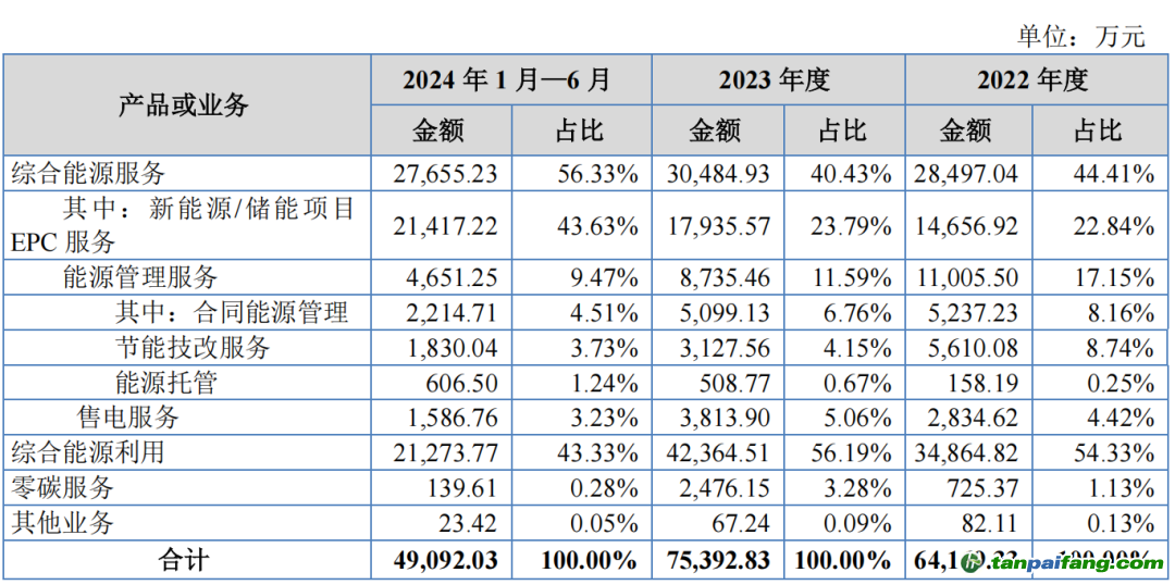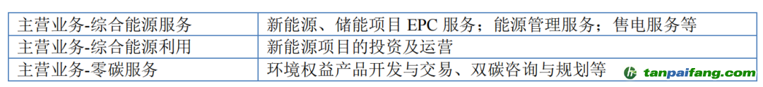 目前,公司聚焦于綜合節(jié)能服務(wù),主營(yíng)業(yè)務(wù)包括綜合能源服務(wù)、綜合能源利用和零碳服務(wù)三大板塊。其中,綜合能源服務(wù)主要包括新能源/儲(chǔ)能項(xiàng)目 EPC 服務(wù)、能源管理服務(wù)、售電服務(wù)等;綜合能源利用主要為新能源項(xiàng)目(含集中式及分布式項(xiàng)目)的投資及運(yùn)營(yíng);零碳服務(wù)主要包括環(huán)境權(quán)益產(chǎn)品開發(fā)與交易、雙碳咨詢與規(guī)劃等。 夲呅內(nèi)傛萊源?。骇鎲┨?排*放^鮫*易-網(wǎng) τā ńpāīfāńɡ.cōm