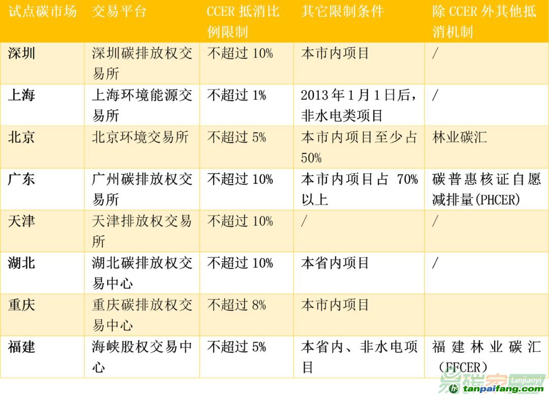 CCER是指依據(jù)國家發(fā)展和改革委員會(huì)發(fā)布施行的《溫室氣體自愿減排交易管理暫行辦法》的規(guī)定,經(jīng)其備案并在國家注冊登記系統(tǒng)中登記的溫室氣體自愿減排量。CCER項(xiàng)目可來源于可再生能源、農(nóng)林行業(yè)、工業(yè)、建筑等領(lǐng)域。目前各個(gè)碳試點(diǎn)都將CCER作為排放配額的抵消標(biāo)的,規(guī)定1噸CCER可以抵1噸配額。但是考慮到CCER交易對配額交易市場的沖擊和為了地方保護(hù)等,各試點(diǎn)碳市場對CCER用于配額抵消設(shè)立了不同的限制條件,抵消比例大多為5%-10%,且對CCER項(xiàng)目的歸屬地、項(xiàng)目類型和開發(fā)時(shí)間均有要求,具體如表1所示。表1 各試點(diǎn)碳市場CCER相關(guān)規(guī)定