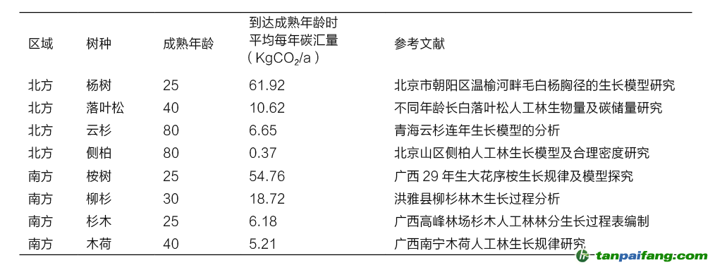 要想知道在一個確定的地點栽植一個確定的樹種的碳匯能力,可參考公開發(fā)表的文獻。舉例見表。