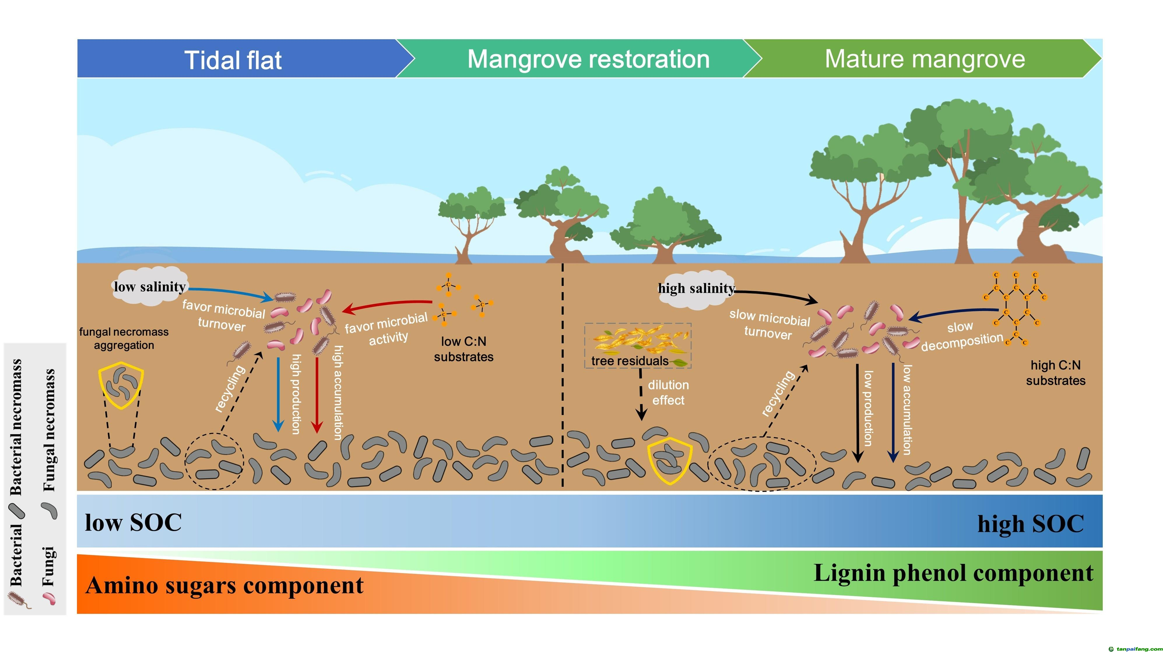 針對上述問題,研究人員以木質(zhì)素酚和氨基糖分別指示植物和微生物來源的有機(jī)碳組分,對比分析了兩者在紅樹林恢復(fù)過程中對土壤有機(jī)碳的貢獻(xiàn)及其影響因子。結(jié)果顯示,紅樹林的恢復(fù)顯著提高了土壤中木質(zhì)素酚和氨基糖的含量,真菌殘體的累積量要顯著高于細(xì)菌。木質(zhì)素酚的形成主要受樹木生物量、土壤總氮、pH和鹽度的影響,而土壤微生物生物量、土壤碳氮比和pH值是影響氨基糖形成的主要因子??傮w而言,隨著紅樹林的恢復(fù),植物來源組分在有機(jī)碳中的占比呈增加趨勢,而微生物來源組分則呈相反趨勢。