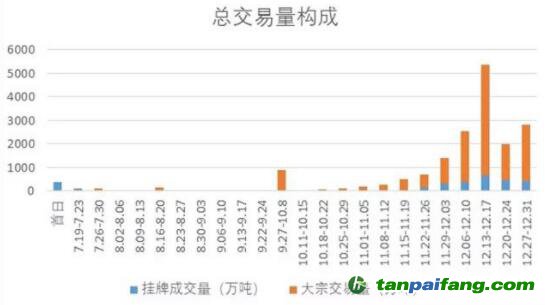 一是價(jià)格(掛牌價(jià))較為穩(wěn)定,整體呈不規(guī)則“浴盆”曲線。如圖1,全國(guó)碳市場(chǎng)價(jià)格整體在40-60元之間,開市首周實(shí)現(xiàn)了價(jià)格的較快上漲,短暫突破60元,其后1個(gè)月內(nèi)價(jià)格呈下降趨勢(shì),隨后價(jià)格長(zhǎng)期維持在43元上下橫盤。橫盤期也是成交量急劇縮量期(如圖2)。進(jìn)入12月份,隨著履約截止日迫近,成交量快速放量,價(jià)格持續(xù)上升。半年周期來看,價(jià)格周K圖呈不規(guī)則“浴盆”曲線,平均掛牌價(jià)格為47.16元/噸。