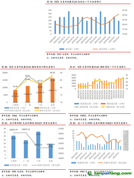本周(5月2日-5月8日)國(guó)外碳配額二級(jí)交易市場(chǎng)交易量漲跌不一,但碳價(jià)均有所上漲。歐盟市場(chǎng)本周EUA現(xiàn)貨成交量下降92.18%,期貨成交量上升22.15%,拍賣市場(chǎng)價(jià)格大幅上漲帶動(dòng)期現(xiàn)貨市場(chǎng)價(jià)格走高,期現(xiàn)貨成交均價(jià)分別上升7.22%、5.37%,本周五歐盟碳價(jià)再次突破90歐元/噸。韓國(guó)市場(chǎng)本周KAU21現(xiàn)貨成交量有所下降,跌幅為45.99%,平均碳價(jià)有所上升,漲幅為0.07%。