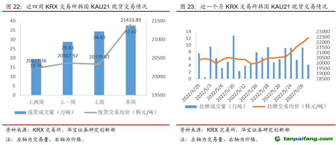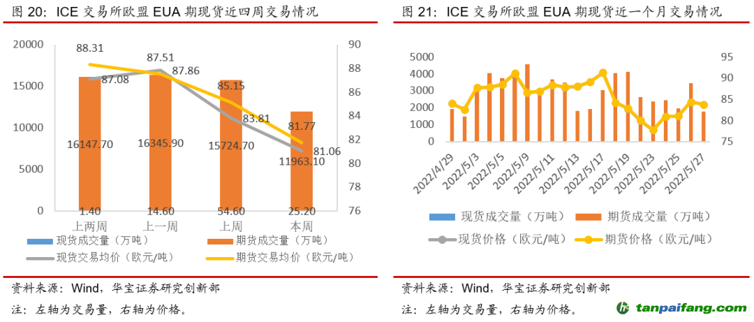 本周(5月23日-5月29日)國(guó)外碳配額二級(jí)市場(chǎng)交易量漲跌不一,碳價(jià)漲跌不一。歐盟市場(chǎng)本周EUA現(xiàn)貨成交量下滑53.85%,期貨成交量下滑降23.92%,現(xiàn)貨成交均價(jià)下降3.28%,期貨成交均價(jià)下跌3.97%,周內(nèi)期現(xiàn)貨碳價(jià)漲幅均超7.7%,周一跌至短期地位77歐元/噸左右后呈超跌反彈趨勢(shì),此外本周一級(jí)市場(chǎng)拍賣量同比上周減少19.87%,供應(yīng)量的減少也對(duì)悲觀情緒的緩解起到作用。韓國(guó)市場(chǎng)本周KAU21現(xiàn)貨成交量漲幅為9.27%,平均碳價(jià)有所上漲,漲幅為5.27%,且周內(nèi)碳價(jià)呈上漲趨勢(shì)。 本+文+內(nèi).容.來(lái).自:中`國(guó)`碳`排*放*交*易^網(wǎng) t a np ai fan g.com
