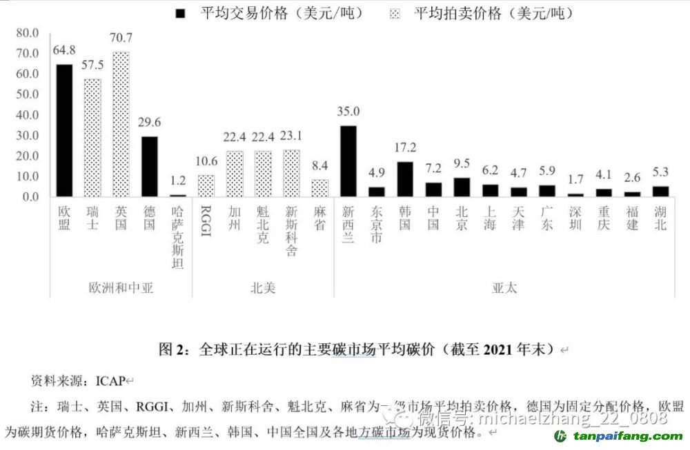 從碳價來看,各市場對外公布的碳價口徑存在差異,包括固定分配價格、拍賣價格、現(xiàn)貨價格、期貨價格等;而由于碳價口徑及不同市場在制度設計、供需等方面的不同,各碳市場的價格差異懸殊。不過,各種口徑的碳價一定程度上都代表了該地區(qū)的碳排放成本,因此仍可大體對比:從2021年的平均碳價來看,英國、歐盟、瑞士的碳價位列前三,均在50美元/噸以上;其次為新西蘭、德國、新斯科舍、加州、魁北克碳市場,碳價在20美元/噸以上;中國、東京、麻省、RGGI等市場的碳價則較低。