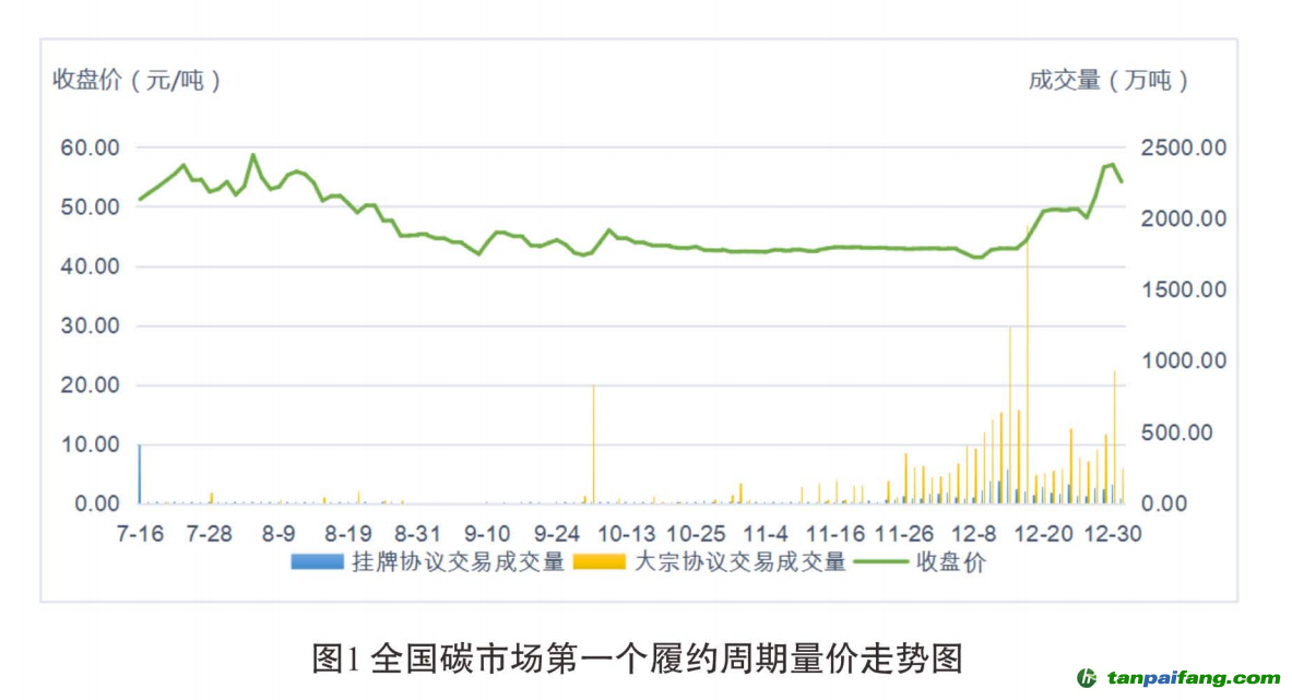 截至2021年12月31日,第一個履約周期共運行114個交易日,碳排放配額累計成交量1.79億噸,累計成交金額76.61億元,成交均價42.85元/噸,每日收盤價在40~60元/噸之間波動,價格總體穩(wěn)中有升。 本+文`內(nèi).容.來.自:中`國`碳`排*放*交*易^網(wǎng) t a np ai fan g.com