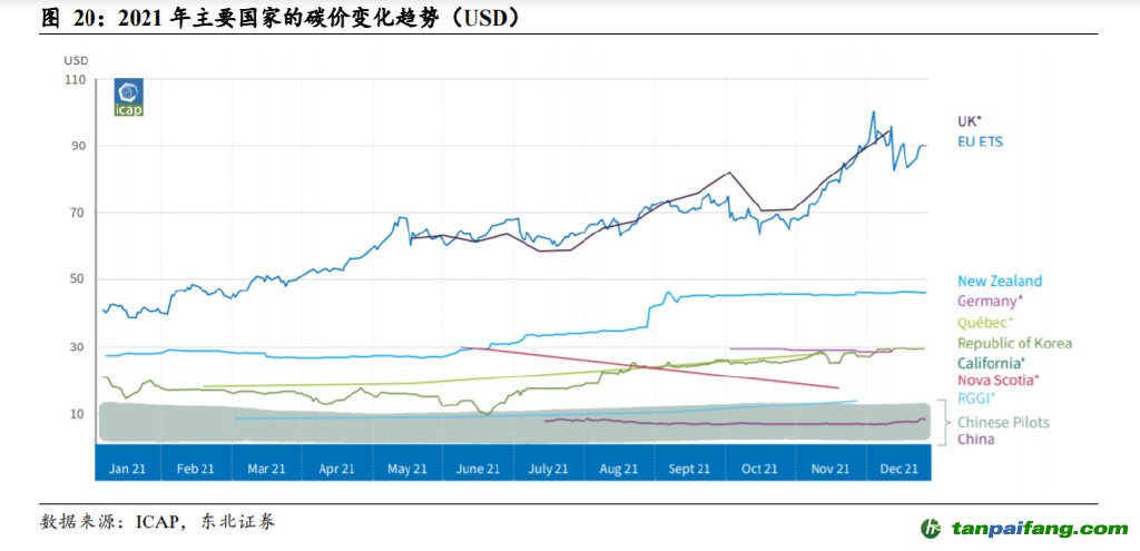 ICAP 發(fā)布的《2022 年全球碳排放交易進度報告》中分別顯示了 2021 年全年主要碳 交易系統(tǒng)的碳價變化,和自 2008 開始全球主要碳交易系統(tǒng)的碳價格變化。根據(jù)報告 顯示,經濟狀況變化和政府規(guī)章制度的調整(包括市場穩(wěn)定機制的津貼等)導致的 碳限額稀缺性變化會帶來短期碳價和長期碳價的影響。 目前英國碳交易市場和歐盟碳交易市場的碳價約在 90 美元,遠超于其他主要的碳 交易系統(tǒng)。中國試點碳交易市場和全國碳交易市場碳價波動性較小,且低于十美元, 同比其他全球主要碳市場位于最低位置,預計僅為歐盟碳價的十分之一。歐盟碳價 格相比與其他碳交易市場較高,也與歐盟碳交易市場目前的市場成熟度與所處的階 段相關。歐盟碳交易市場共經歷了四個階段,從最開始的拍賣和免費發(fā)放分配配額 逐漸轉換到以拍賣代替免費發(fā)放碳配額,從而碳配額供應鏈,因此歐盟交易市場碳 價一路高升。 本/文-內/容/來/自:中-國-碳-排-放-網-tan pai fang . com