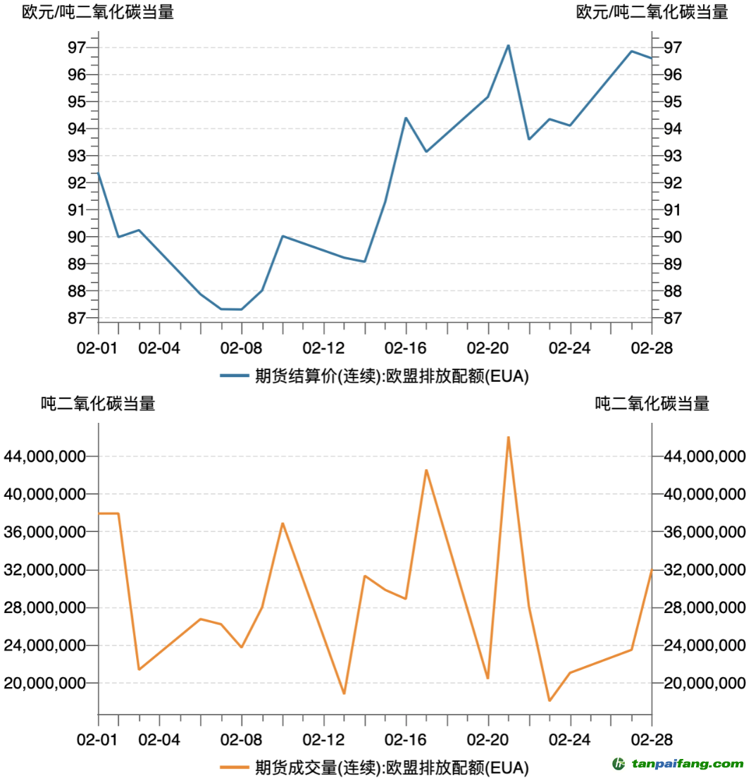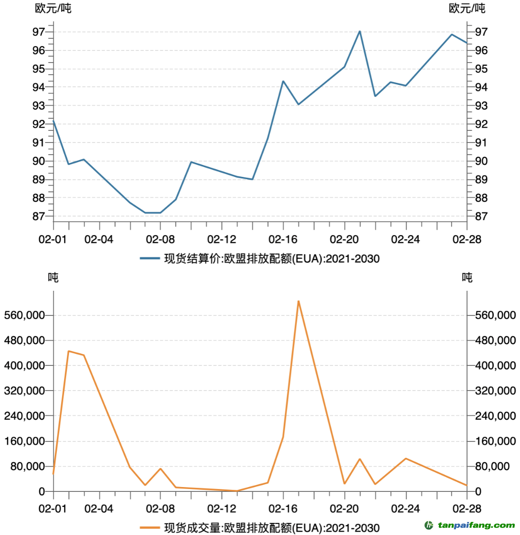 2月歐盟碳排放配額(EUA)現(xiàn)貨總成交量219.80萬(wàn)噸,總成交金額2.01億歐元,現(xiàn)貨成交均價(jià)91.67歐元/噸;期貨總成交量5.79億噸,總成交金額533.05億歐元,期貨成交均價(jià)92.02歐元/噸。2月EUA現(xiàn)貨結(jié)算價(jià)最低87.18歐元/噸,最高97.04歐元/噸;期貨結(jié)算價(jià)最低87.31歐元/噸,最高97.08歐元/噸。
