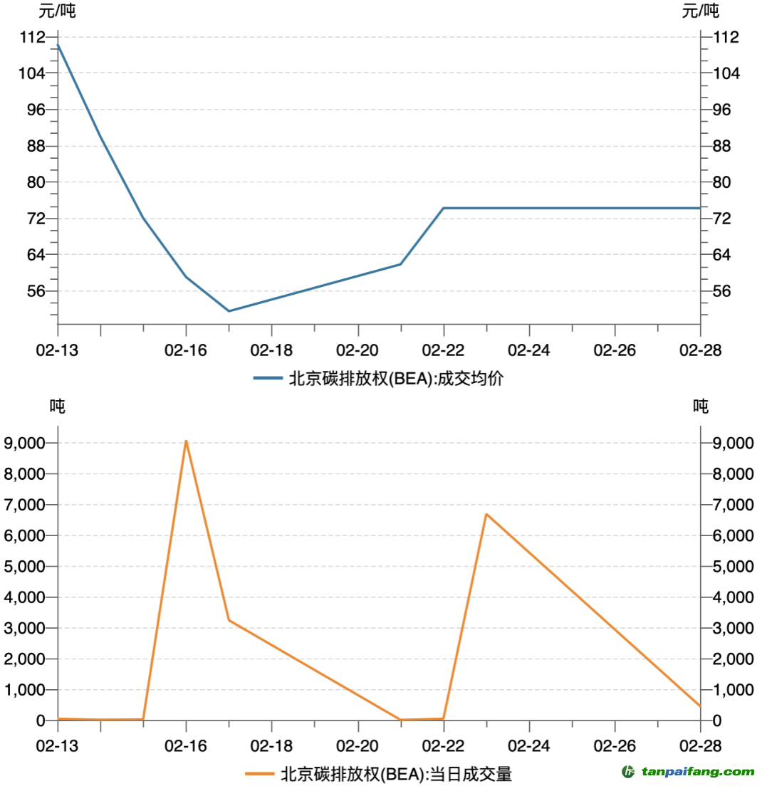 2月北京碳市場(chǎng)碳排放配額(BEA)總成交量1.96萬(wàn)噸,總成交額124.57萬(wàn)元,成交均價(jià)63.50元/噸。2月最后一個(gè)交易日成交均價(jià)74.20元/噸,較1月最后一個(gè)交易日成交均價(jià)138.00元/噸下降了46.23%。截至2月28日,BEA累計(jì)成交量1819.09萬(wàn)噸,累計(jì)成交額12.29億元。