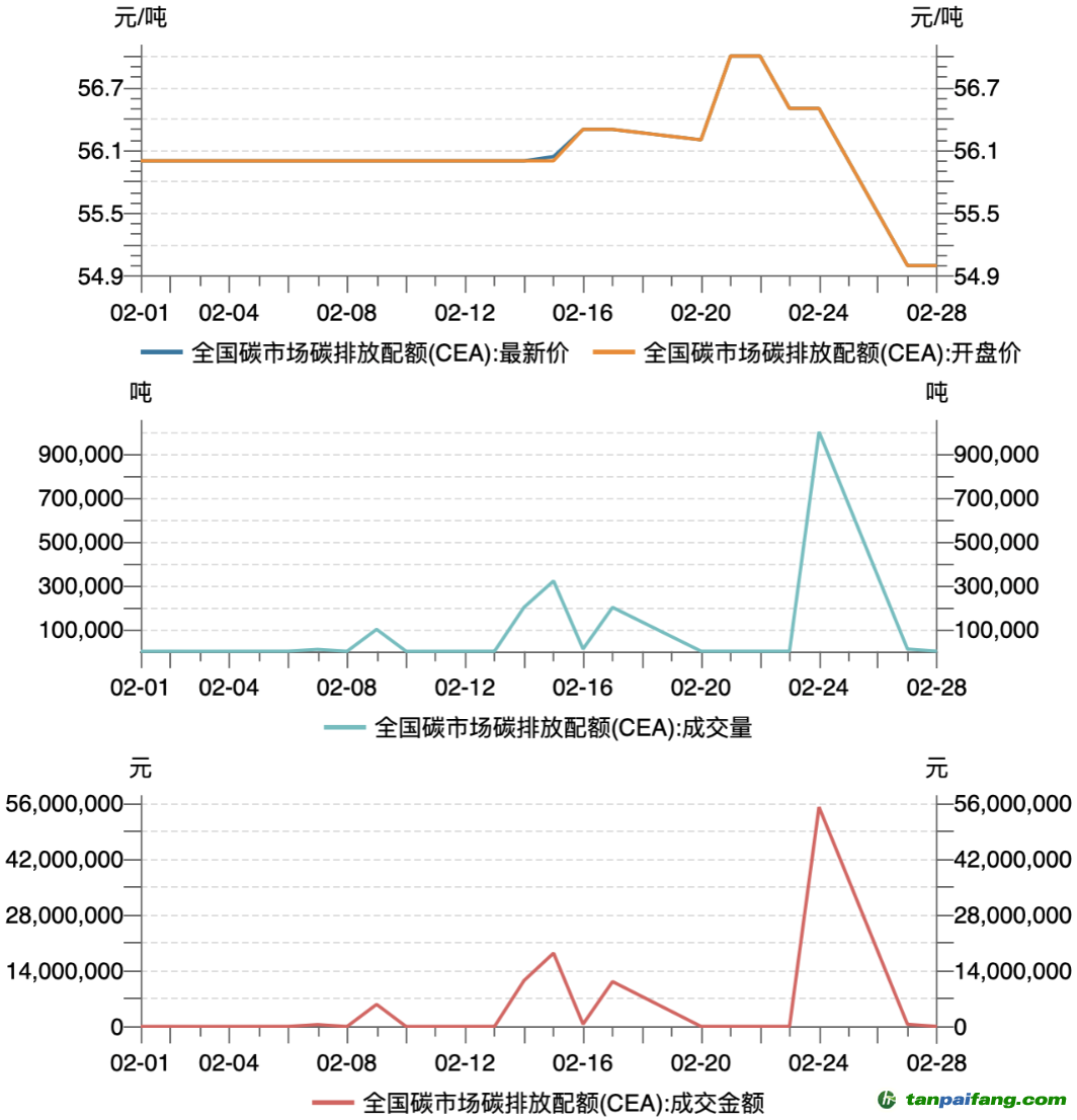 2月全國(guó)碳市場(chǎng)碳排放配額(CEA)總成交量及總成交金額較1月有所回升,日均成交量9.27萬(wàn)噸,日均成交額517.98萬(wàn)元。2月上半月,CEA價(jià)格始終維持在56元/噸;下半月,CEA價(jià)格先上升后下降,月末以55元/噸收盤(pán)。可以發(fā)現(xiàn),春節(jié)假期過(guò)后,全國(guó)碳市場(chǎng)逐漸回暖,交易活躍度有所上升。2月7日,生態(tài)環(huán)境部辦公廳發(fā)布《關(guān)于做好2023-2025年發(fā)電行業(yè)企業(yè)溫室氣體排放報(bào)告管理有關(guān)工作的通知》,并提及“石化、化工、建材、鋼鐵、有色、造紙、民航等行業(yè)企業(yè)溫室氣體排放報(bào)告管理有關(guān)工作安排另行通知”。