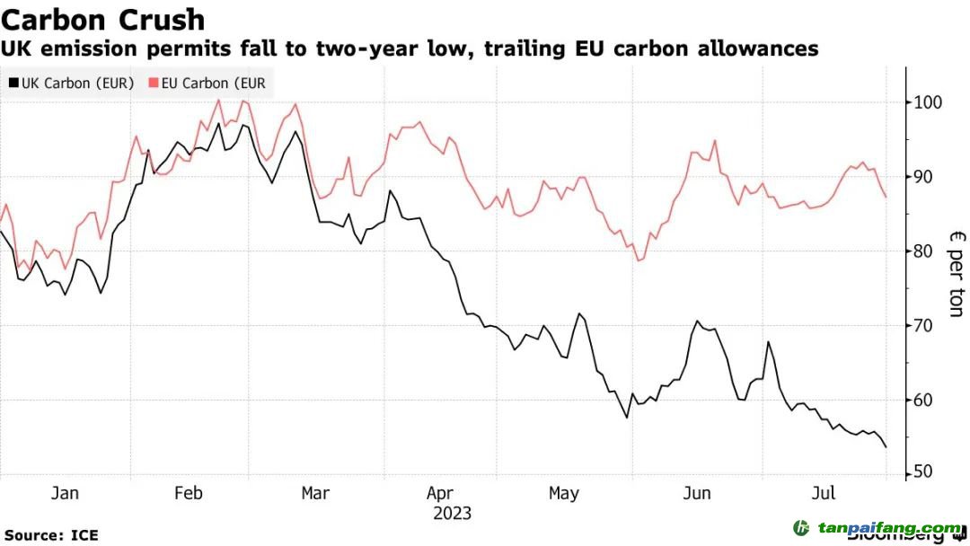 ICE數(shù)據(jù)顯示:7月以來,歐盟的碳配額為每噸CO2e 83.12歐元(90.96美元)左右,比英國碳配額高出近40美元/噸。自2021年英國推出本國的碳市場以來,碳價格一直高于或等于歐盟水平。