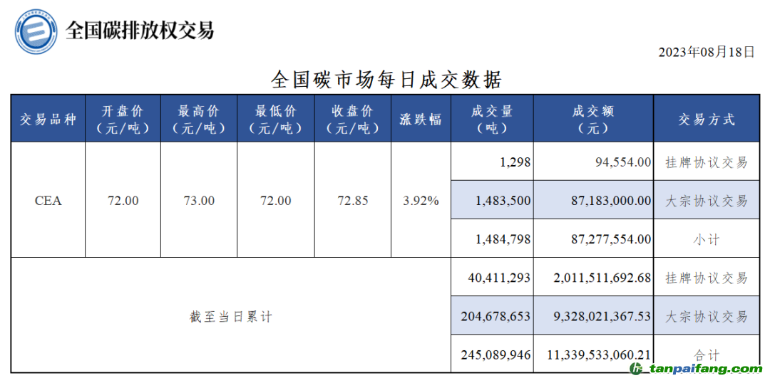 截至今日,全國碳市場碳排放配額(CEA)累計成交量245,089,946噸,累計成交額11,339,533,060.21元。