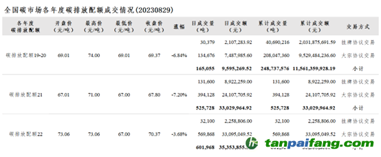 8月29日全國碳市場三類配額具體交易行情(來源:上海環(huán)境能源交易所) 本+文內(nèi).容.來.自:中`國`碳`排*放*交*易^網(wǎng) ta np ai fan g.com
