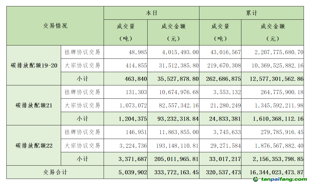 截至今日,全國(guó)碳排放權(quán)交易市場(chǎng)累計(jì)成交總量320,537,473噸,累計(jì)成交總額16,344,023,473.87元。