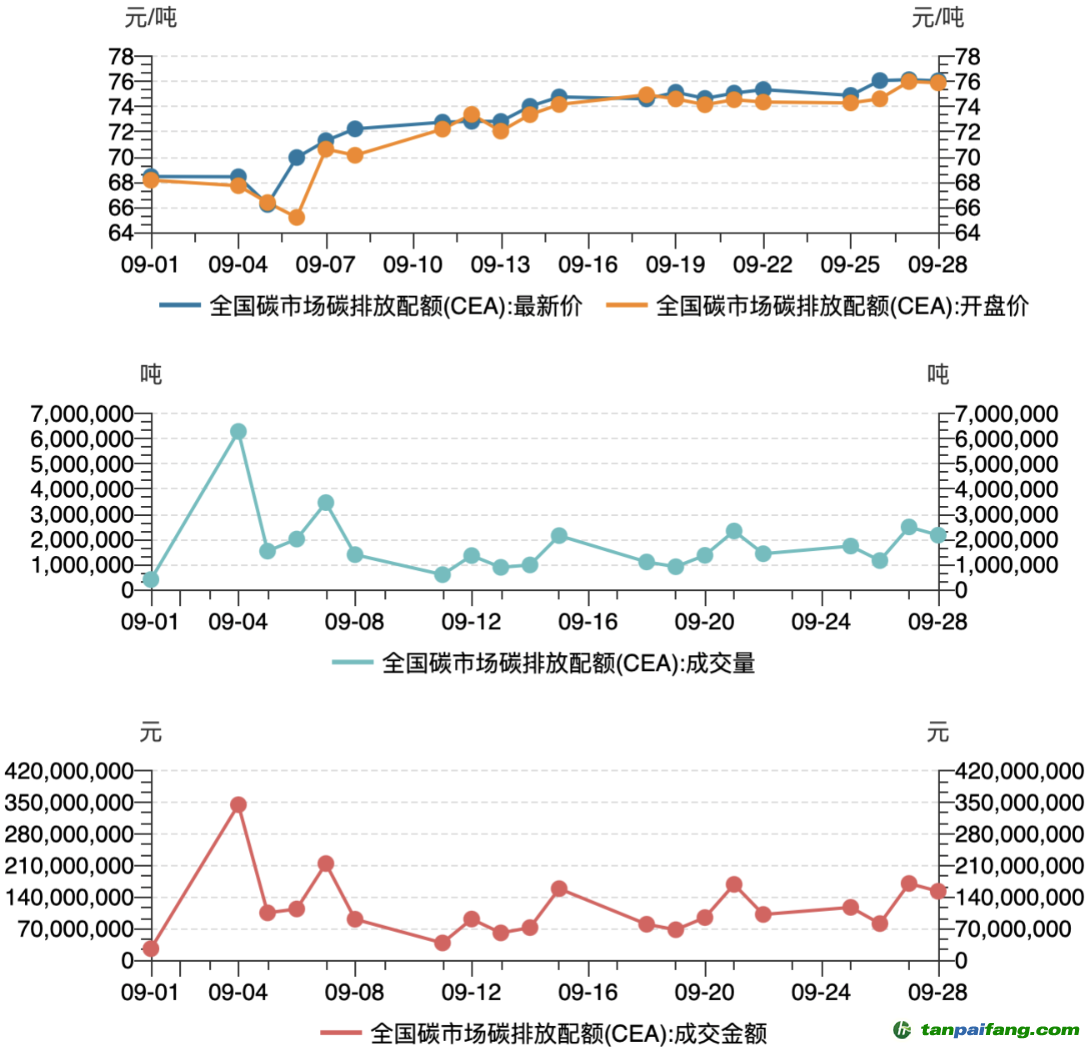 全國碳市場碳價屢創(chuàng)新高,CEA價格呈現(xiàn)先小幅降低后大幅上漲的走勢,收盤價由月初的低于70元/噸漲至月末的76元/噸左右,最高價達(dá)到77元/噸。9月CEA成交均價達(dá)到65.74元/噸,較8月上漲6.67%。同時,由于履約期的不斷臨近,進(jìn)一步刺激全國碳市場碳交易,CEA交易量激增。 內(nèi).容.來.自:中`國*碳-排*放*交*易^網(wǎng) t a npai fa ng.com