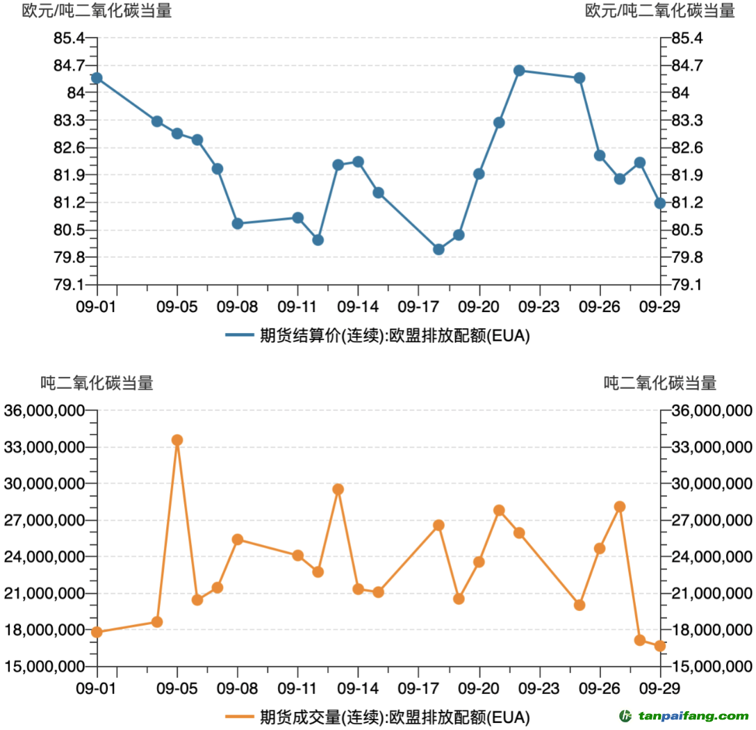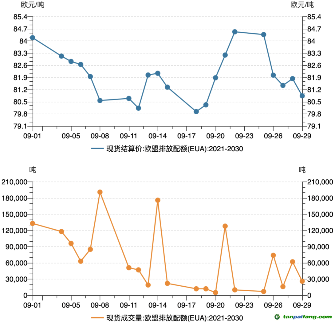 9月歐盟碳排放配額(EUA)現(xiàn)貨成交量135.30萬噸,期貨成交量4.87億噸。9月EUA現(xiàn)貨結(jié)算價最低79.93歐元/噸,最高84.53歐元/噸;期貨結(jié)算價最低79.99歐元/噸,最高84.56歐元/噸。 本+文內(nèi).容.來.自:中`國`碳`排*放*交*易^網(wǎng) ta np ai fan g.com