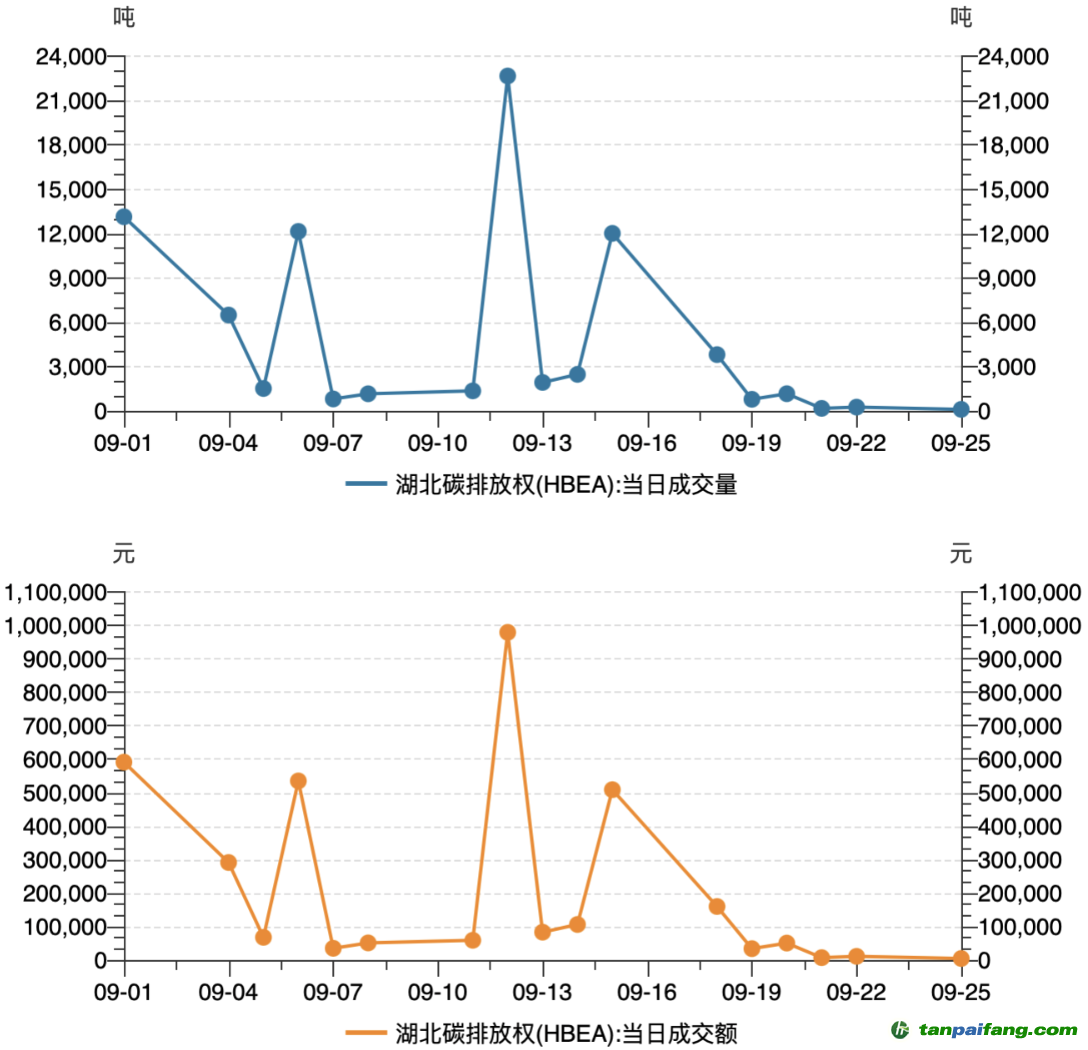 9月湖北碳市場碳排放配額(HBEA)掛牌交易成交量8.19萬噸,成交額357.54萬元。期間,最高成交價47.69元/噸,最低成交價40.21元/噸,成交均價43.64元/噸。9月最后一個交易日收盤價44.51元/噸,較8月最后一個交易日收盤價45.01元/噸下跌1.11%。截至9月30日,HBEA(不包括遠(yuǎn)期和拍賣)累計成交量1.08億噸,累計成交額27.11億元。