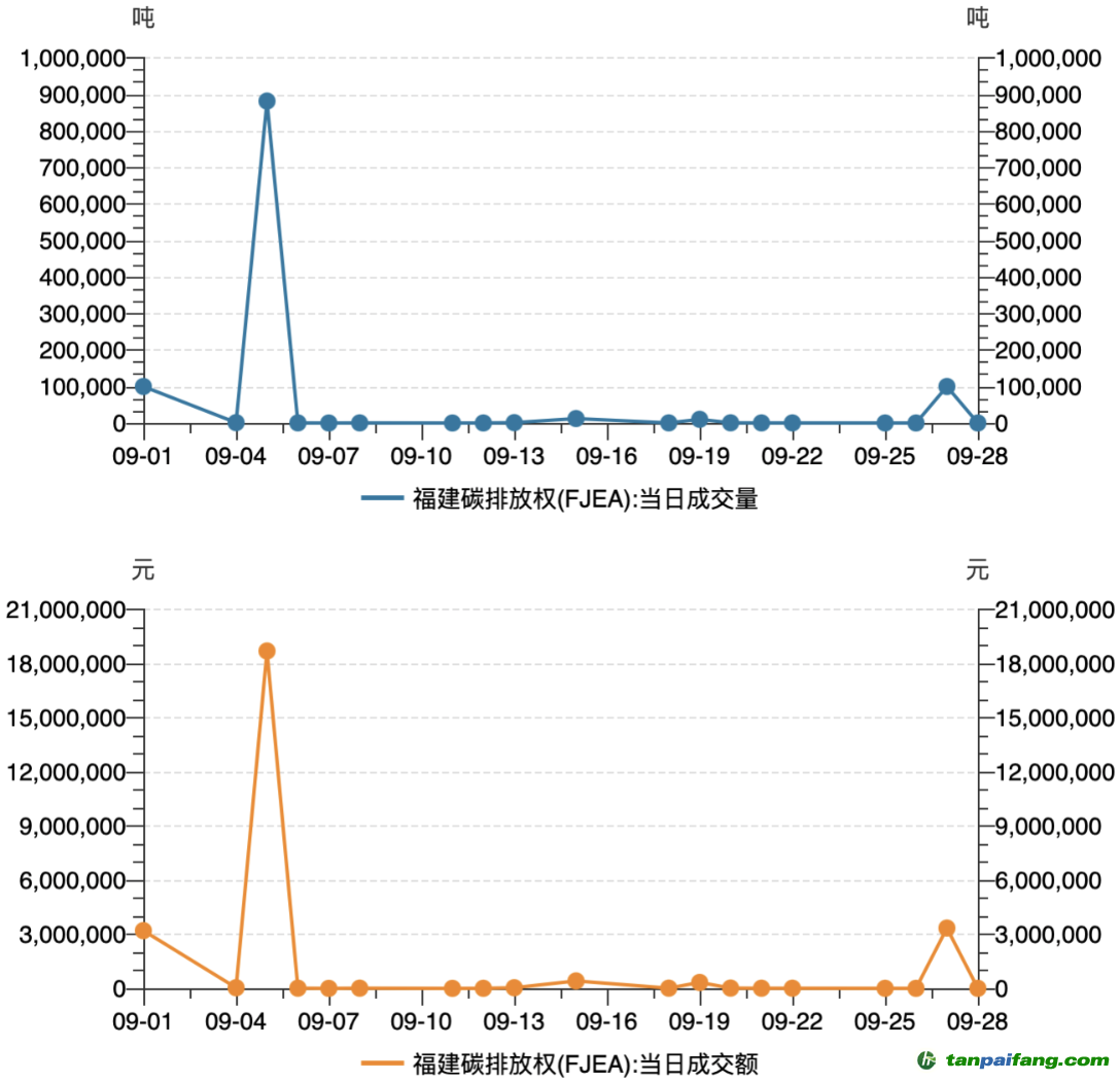 9月福建碳市場碳排放配額(FJEA)成交量110.78萬噸,成交額2611.94萬元。9月最后一個交易日收盤價36.74元/噸,較8月最后一個交易日收盤價33.50元/噸上漲9.67%。