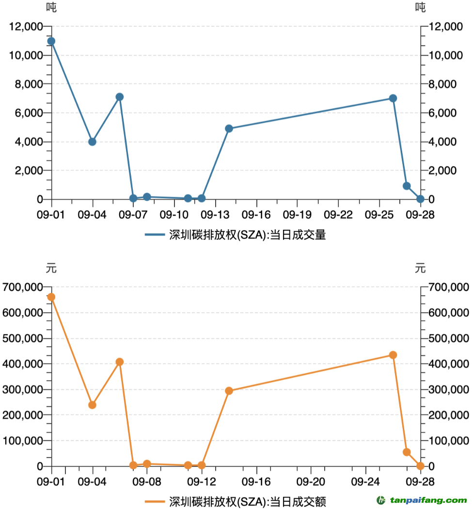 9月深圳碳市場碳排放配額(SZEA)成交量3.51萬噸,成交額210.58萬元。期間,最高成交價66.00元/噸,最低成交價54.11元/噸,成交均價59.91元/噸。9月最后一個交易日收盤價60.00元/噸,較8月最后一個交易日收盤價61.25元/噸下跌2.04%。截至9月30日,SZEA累計成交量7333.29萬噸,累計成交額18.54億元。